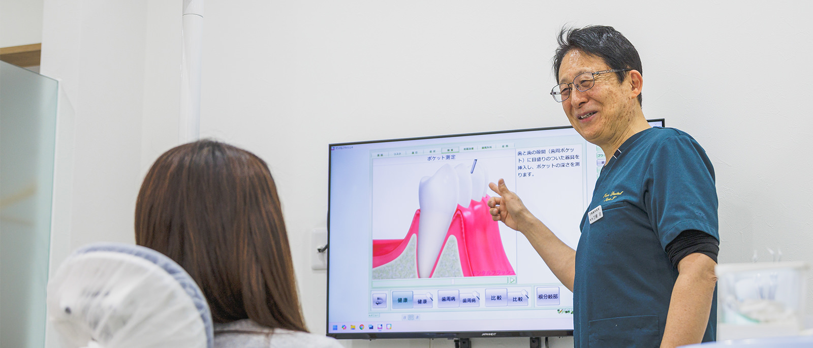 刀根歯科医院では、早期発見・早期治療・予防を大切に、患者様の歯を守るための歯周病治療をおこなっています。